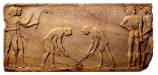 | Ανάγλυφο με σκηνή αθλοπαιδιάς (χόκεϊ) στη βάση αγάλματος κούρου. 500-490 π.Χ. Αθήνα, Εθνικό Αρχαιολογικό Μουσείο 3477. ΥΠ.ΠΟ./ΤΑΠ. Σπαθάρη, Έ., Το Ολυμπιακό πνεύμα, εκδόσεις ΑΔΑΜ, Αθήνα 1992, σ. 188. ©ΥΠ.ΠΟ. (πηγή: ΙΜΕ) |