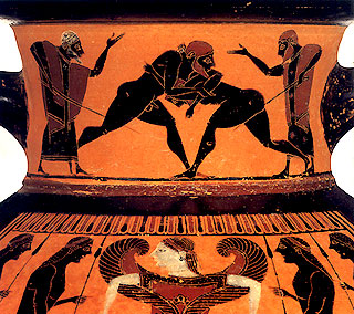 | Ελλανοδίκες επιβλέπουν αγώνα πάλης. Παράσταση σε μελανόμορφο αμφορέα του ζωγράφου του Άμαση. Τέλη 6ου αι. π.Χ. Σπαθάρη, Έ., Το Ολυμπιακό πνεύμα, εκδόσεις ΑΔΑΜ, Αθήνα 1992, σ. 126. ©Antikenmuseum und Sammlung Ludwig, Basel (πηγή: ΙΜΕ) |