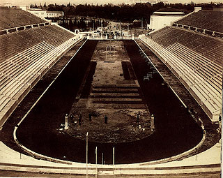 | Το εσωτερικό του Παναθηναϊκού Σταδίου λίγο πριν την έναρξη των Ολυμπιακών Αγώνων του 1896. Αθήνα, Ελληνικό Λογοτεχνικό και Ιστορικό Αρχείο. Σπαθάρη, Έ., Το Ολυμπιακό πνεύμα, εκδόσεις ΑΔΑΜ, Αθήνα 1992, σ. 327. ©ΕΛΙΑ (πηγή: ΙΜΕ) |
