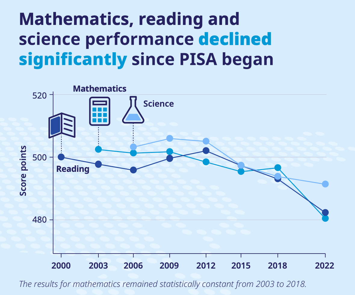 Επομένως, το διάγραμμα κρούει τον κώδωνα του κινδύνου για τα εκπαιδευτικά συστήματα παγκοσμίως, καθώς η πτώση του 2022 (που πιθανώς συνδέεται με τις επιπτώσεις της πανδημίας στην εκπαίδευση) είναι η μεγαλύτερη που έχει καταγραφεί από την έναρξη του προγράμματος.